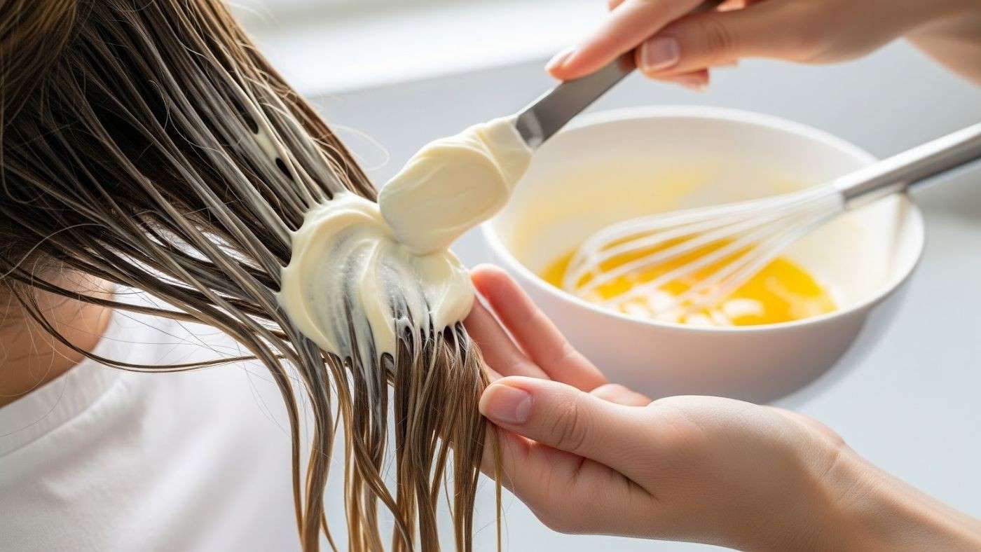 Applying egg and yogurt protein hair mask to clean damp hair for strength and elasticity